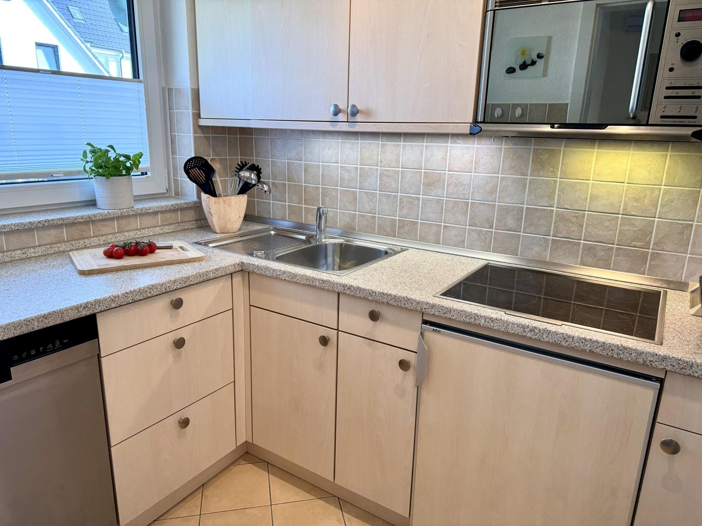 LACHMÖWE – die ca. 74 m² große Ferienwohnung bietet Platz für bis zu 4 Personen und liegt in zentraler Strandlage in Wenningstedt. Über zwei Ebenen erstreckt sich eine gemütliche, helle Inneneinrichtung. Im Erdgeschoss befindet sich der Wohnbereich samt Sofaecke, Essbereich und TV. Von dort aus erreichen Sie die Terrasse, von der Sie die untergehende Sonne mit Blick Richtung Meer genießen können. Die Morgensonne begrüßt Sie in der separaten Küche, die mit allen wichtigen Utensilien ausgestattet ist (Cerankochfeld, Mikrowelle, Geschirrspüler, Kühlschrank mit Gefrierfunktion, Elektroküchengeräten) ‒ bitte bedachten Sie, dass kein Backofen vorhanden ist. Ein Gäste-WC inkl. Waschmaschine befindet sich ebenfalls im Erdgeschoss. Über eine Treppe gelangen Sie ins Untergeschoss, welches zwei Schlafzimmer sowie ein Tageslichtbad für Sie bereithält. Das großzügige Schlafzimmer verfügt über ein 180x200 cm Doppelbett und einem geräumigen Wandschrank, der genügend Stauraum für einen Sylturlaub bietet. Das kleinere Doppelzimmer hält ein 140x200 cm Bett für Sie bereit. Das Tageslichtbad verfügt über eine Dusche, ein WC sowie ein Waschbecken. Das kostenfreie WLAN sowie ein PKW-Stellplatz runden das Angebot ab. Haustiere sind leider nicht erlaubt.