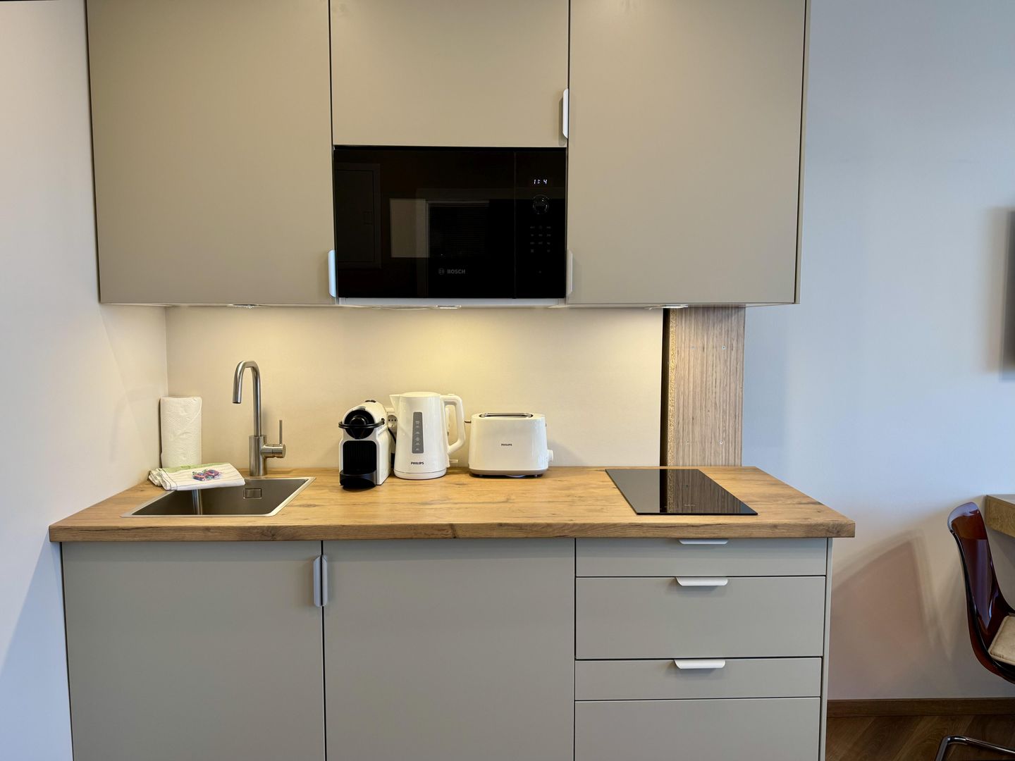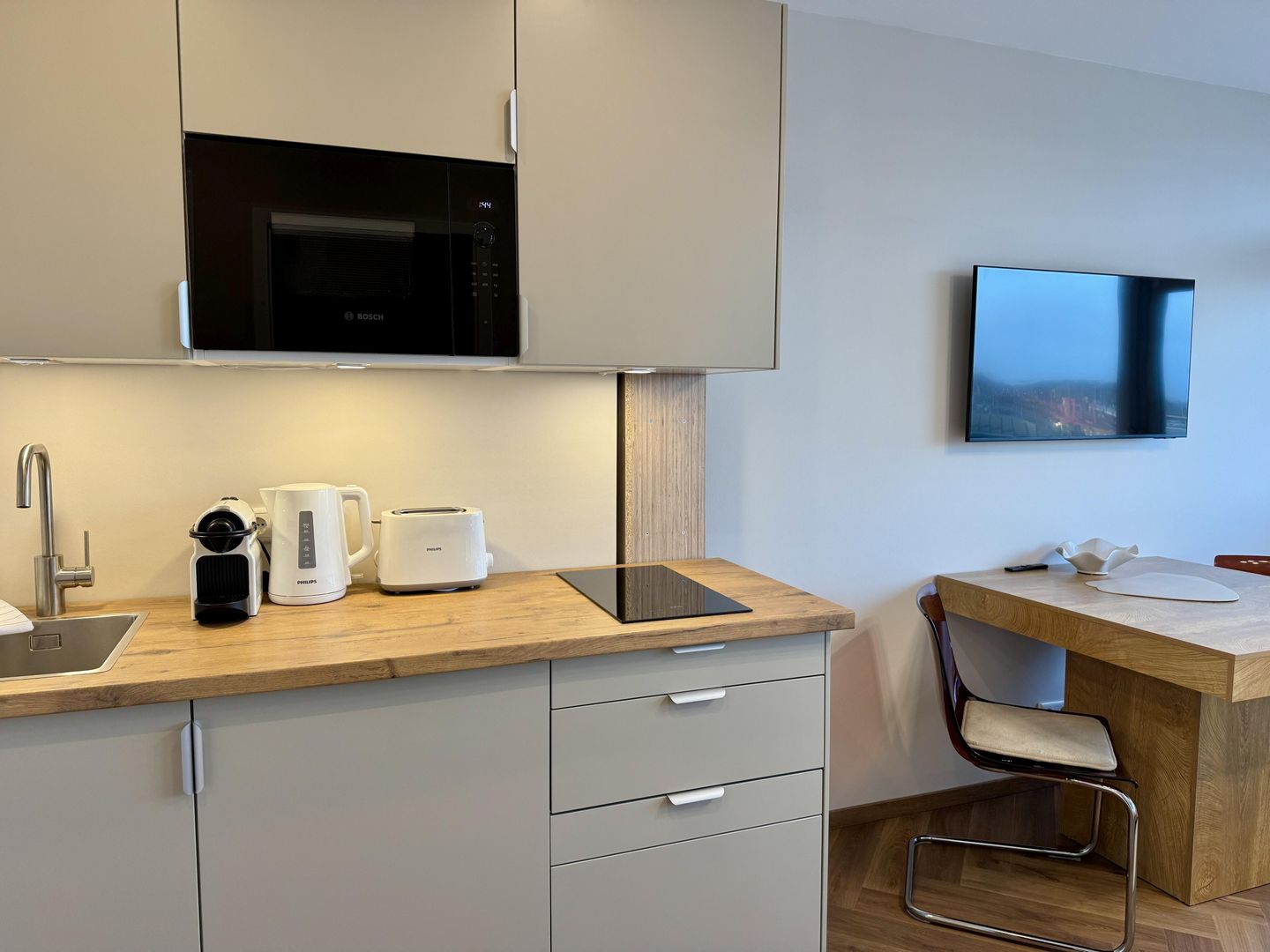 BOJE – das moderne, 2025 renovierte 1-Zimmer App. bietet Ihnen eine günstige Gelegenheit, mitten im Herzen von Westerland zu wohnen – nur wenige Gehminuten vom Strand, den Einkaufsmöglichkeiten und dem Bahnhof entfernt. Auf ca. 24 m² finden bis zu 2 Personen Platz. Der kombinierte Wohn- und Schlafbereich ist mit einem gemütlichen Doppelbett (160 x 200 cm), einem Kleiderschrank und einer kleinen Essecke ausgestattet. Die Küchenzeile inkl. Mikrowelle, Kühlschrank und 2-Platten Herd ist mit allem wichtigen ausgestattet und eignet sich ideal für die Zubereitung von kleinen Mahlzeiten. Der sonnige Frühstücksbalkon lädt samt Balkonmöbeln zum Entspannen ein. Das vorhandene Duschbad, WLAN, ein PKW-Stellplatz (max. Einfahrtshöhe 2,50 m) und der Fahrstuhl im Haus runden das Angebot ab. Haustiere sind herzlich willkommen.